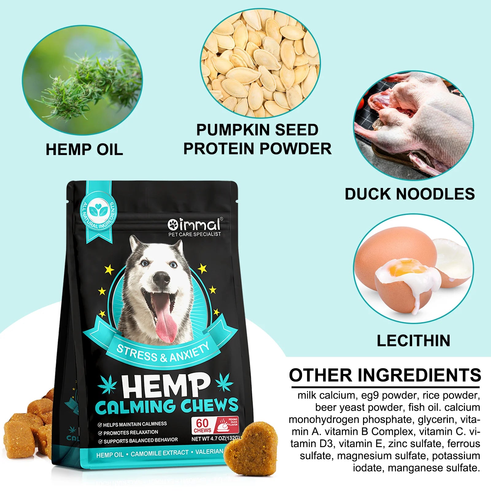Pumpkin seed protein powder, duck meat powder, chicken powder, milk calcium, eg9 powder, rice flour, beer yeast powder, fish oil. Dicalcium Phosphate, Lecithin, Glycerin, Vitamin A, Vitamin B Complex, Vitamin C, Vitamin D3, Vitamin E, Zinc Sulfate, Ferrous Sulfate, Magnesium Sulfate, Potassium Iodate, Manganese Sulfate.
