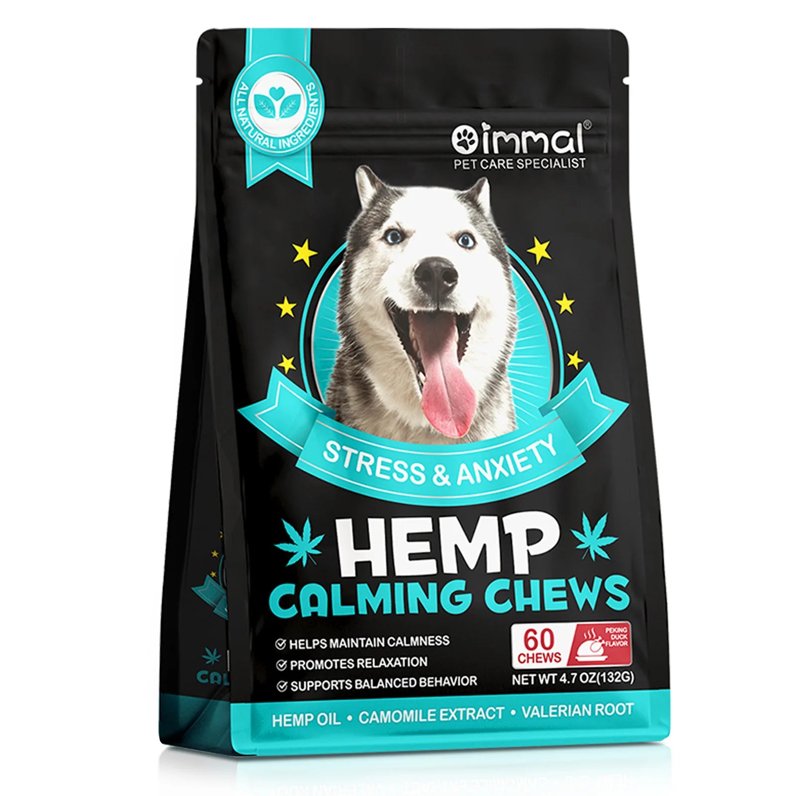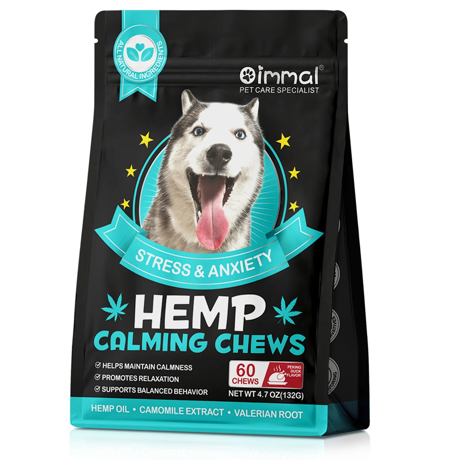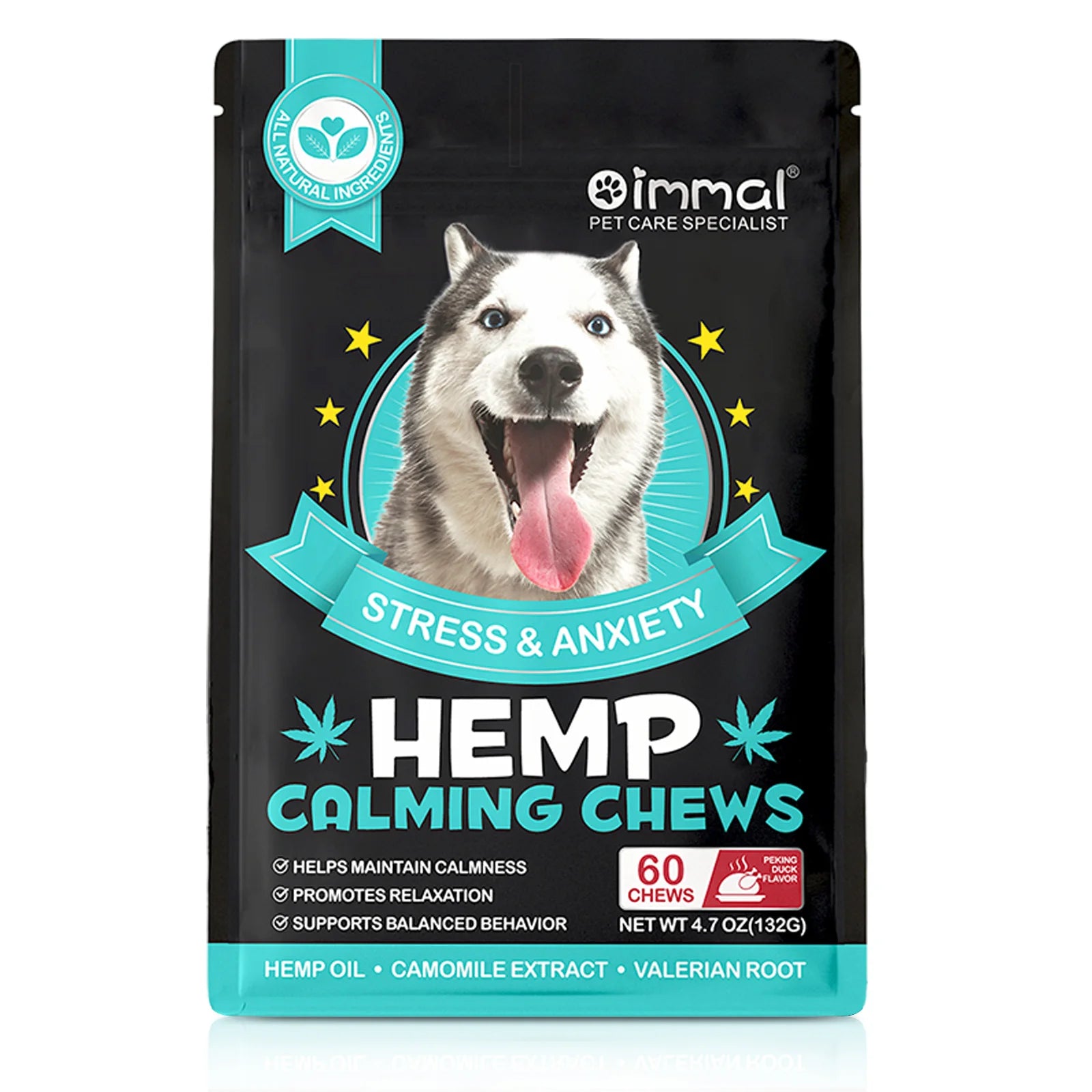 60 Calming Chews for Dogs Stress & Anxiety with Peking Duck Flavor Chamomile Extract Valerian Root Calmness Promotes Relaxation